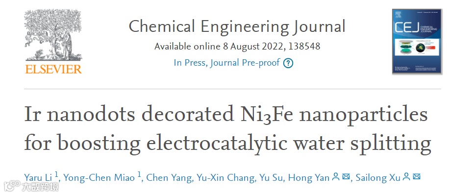 YaruLi1, Yong-ChenMiao1, ChenYang, Yu-XinChang, YuSu, HongYan*, SailongXu*, Ir nanodots decorated Ni3Fe nanoparticles for boosting electrocatalytic water splitting, Chemical Engineering Journal, Available online 8 August 2022, 138548,