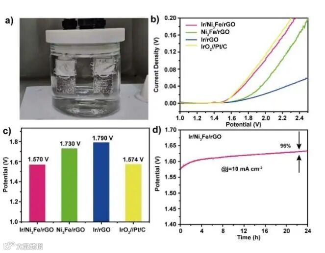 图6(a)电解水生成氧气和氢气的电子图片;(b)极化曲线;(c)10 mA cm-2电流密度下的电压;(d)计时电位测试