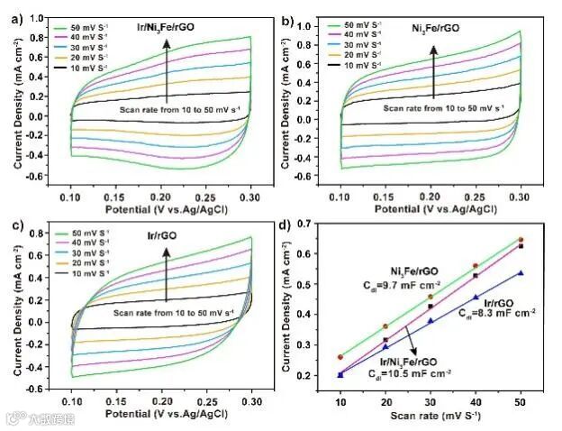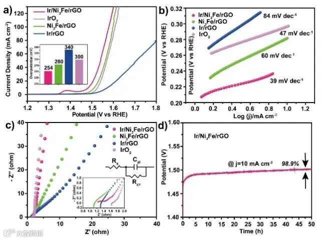 XPS结果表面,Ni和Fe的键能在Ir/Ni3Fe/rGO中比在Ni3Fe/rGO中更高,造成这一变化的原因是Ir纳米颗粒影响了Ni3Fe合金的电子结构,即Ni和Fe失去电子,XPS峰向键能更高的方向偏移。众多文献说明,失去电子的Ni或Fe单质在OER过程中更容易被氧化生成NiOOH或FeOOH,因此加快析氧反应过程。