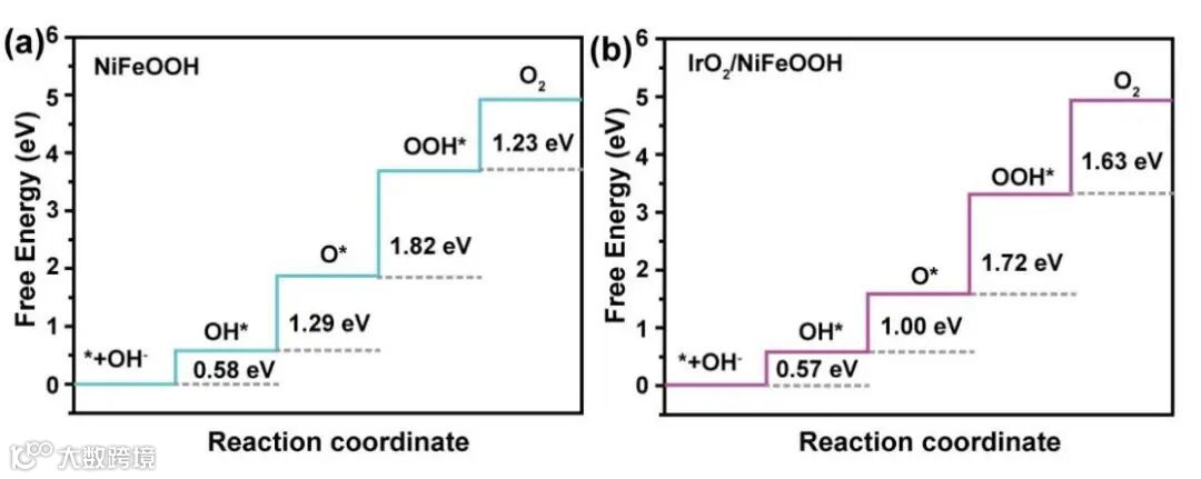 图8(a)NiFeOOH 和(b)IrO2/(NiFe)OOH在OER过程的吉布斯自由能图