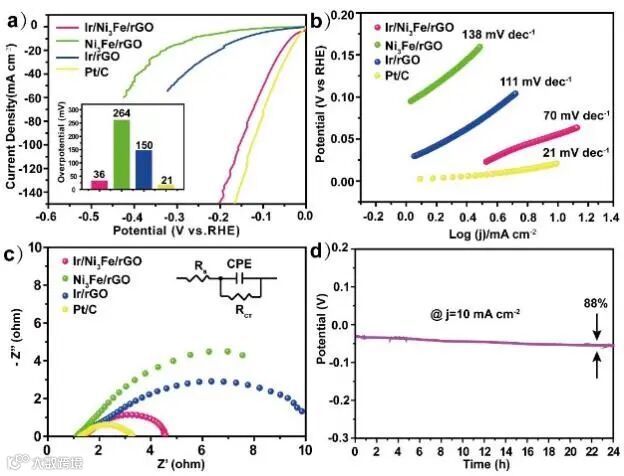 Ir纳米点有效提升了Ni3Fe合金的OER、HER和电解水性能。这是因为Ir纳米点降低了合金在OER和HER反应中的Tafel斜率、电荷转移电阻,并增加了活性位点,因此加快了反应动力学。