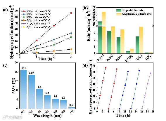 在室温条件下的性能测试中,我们利用苄胺作为空穴牺牲剂,无任何助催化剂,PCN-3平均产氢速率达到22.2 mmol g-1 h-1,约为纯C3N4的200倍,是目前已知的产氢速率最高的CN光催化剂。同时,氧化苄胺的速率也可达到41.6 mmol g-1 h-1,且只有N-苄烯丁胺这一氧化产物。此外,PCN-3协同产氢的表观量子效率如Fig.3(c)所示,在420 nm波长光照下的光利用率可达16.8%,优于目前已报道的任何催化剂。