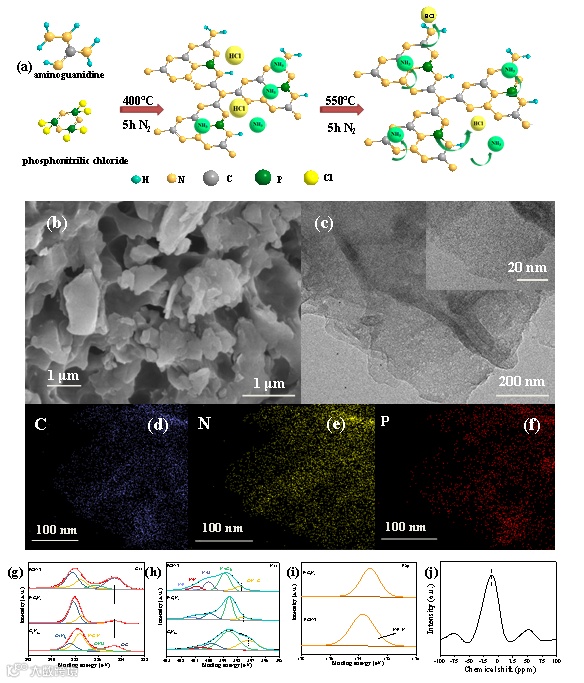 Fig. 2. (a) Schematic diagram of sample synthesis. (b) SEM, (c) TEM and (d-f) the elemental mapping images of PCN-3. XPS (g) C 1s, (h) N 1s and (i) P 2p spectra of as prepared samples. (j) Solid-state 31P NMR of PCN-3.