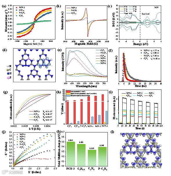 Fig. 4. (a) Magnetic field curves and (b) EPR spectroscopy of the P-C3N4, C3N5.4 and PCN-3. (c) Calculated density of states and (d) the polarized charge distribution of PCN-3. (e) Steady-state PL spectra, (f) time-resolved transient PL, (g) integrated PL emission intensity as a function of temperature, (h) characterization of the built-in electric field, (i) photocurrent response, (j) EIS Nyquist plots and (k) Total Muliken charge of as prepared samples. (l) Change density difference of PCN.