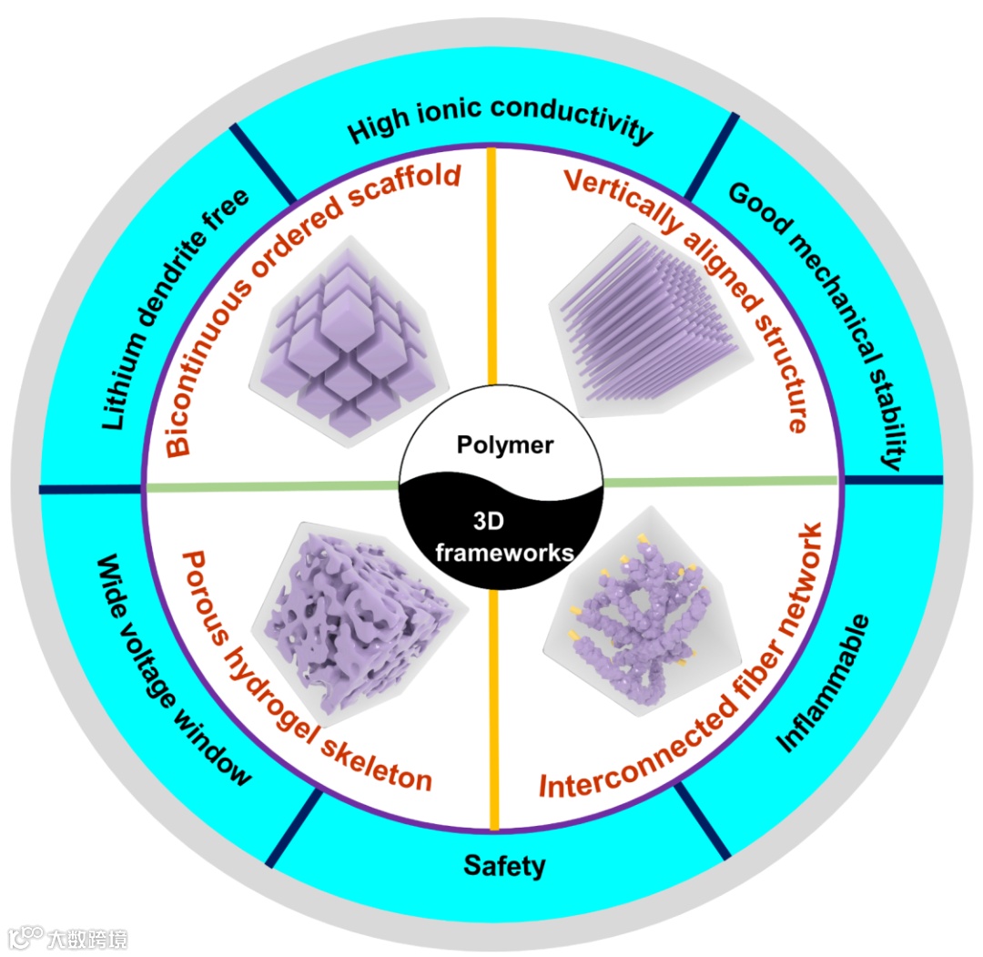 基于此,武汉理工大学徐林教授系统总结了近年来复合聚合物电解质中3D框架填料的研究进展和成果,包括3D框架填料的结构设计和制备方法,以及离子传输机理等。其中,作者将3D框架填料依据不同结构系统总结为四大类,包括双连续有序3D框架填料、垂直3D框架填料、纤维状3D框架填料以及多孔的水凝胶/气凝胶3D框架填料,如图1。