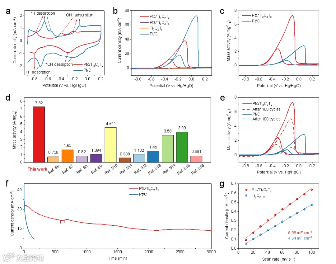 图3. Ptc/Ti3C2Tx和相关对比样的甲醇电氧化测试。