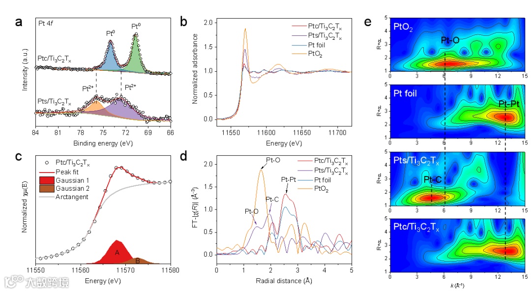 图2. Ptc/Ti3C2Tx和相关对比样的X射线吸收谱分析。