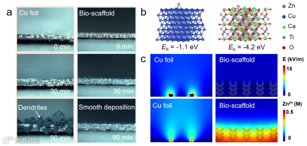 图二. 仿生集流体上的锌沉积实验和模拟。