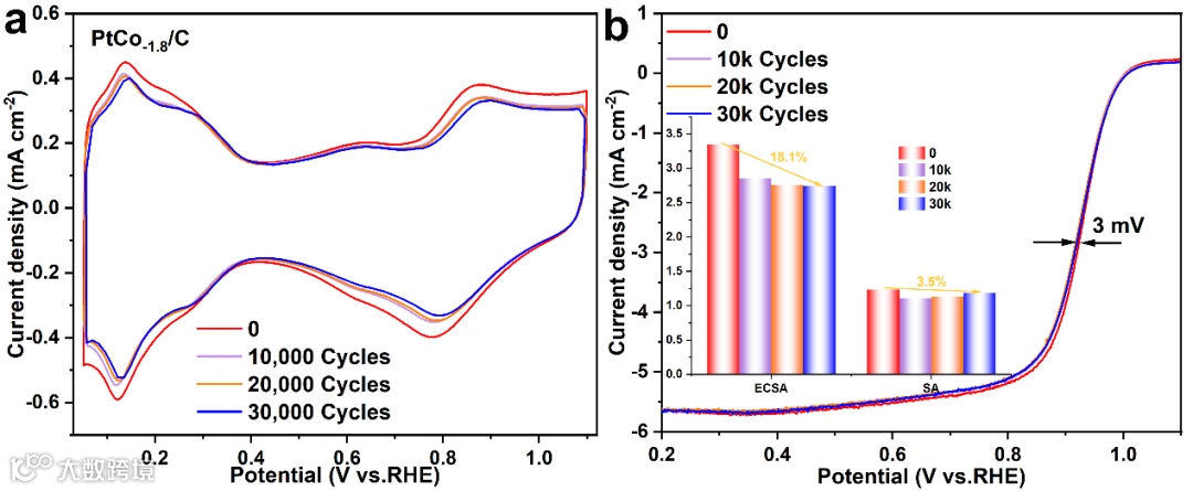 图8. 优化的PtCo-1.8/C样品的ADT测试。(a) 经过1万、2万、3万圈ADT后的催化剂上的CV曲线。(b) 经过1万、2万、3万圈ADT后的LSV曲线。图8b中的插入柱状图是ADT前后对应的ECSA以及SA数据对比。