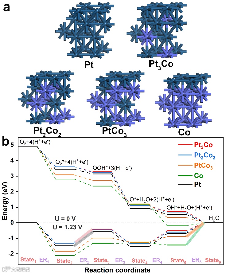 图7. (a) DFT构建的不同表面Pt:Co原子比(纯Pt、Pt3Co、Pt2Co2、PtCo3和纯Co)的模型。(b) U=0 V和U=1.23 V时,不同模型上ORR路径的能量分布图。Staten (n=1-6)是指电化学吸附过程中的中间体。ERn (n=1-5)是四电子ORR途径的基本反应。