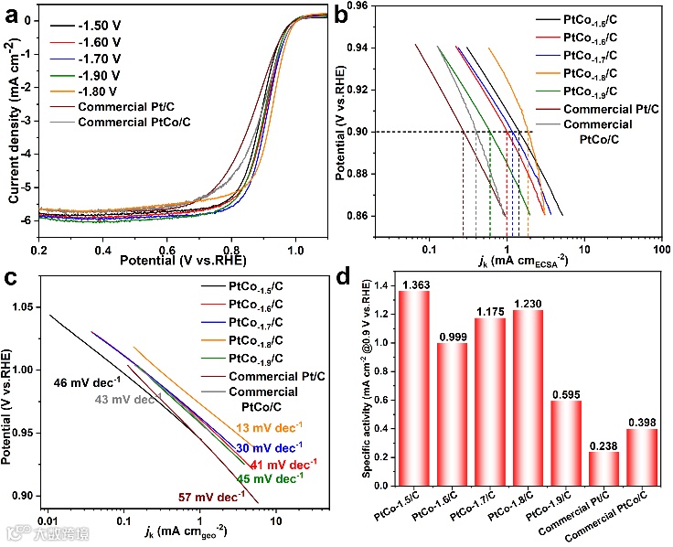 图6. PtCo/C系列电催化剂的ORR活性对比。(a)在O2饱和的0.1 M HClO4溶液中,扫描速率为10 mV s-1,测试得到的LSV极化曲线。(b)以jk为自变量的ORR过程混合控制区的Tafel图。(c)在低过电位区域的Tafel斜率比较。(d)商业Pt/C和商业PtCo/C电催化剂的面积比活性值对比。