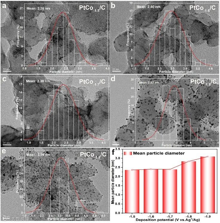 图2. 通过改变沉积电位得到的系列PtCo/C电催化剂的TEM图和粒径分布直方图。