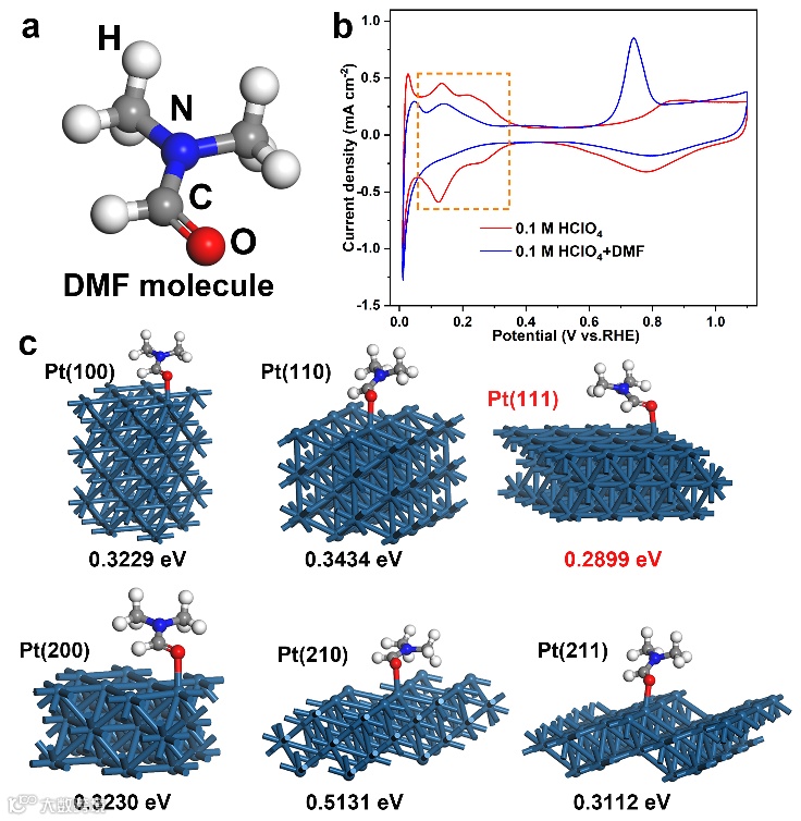 图4. 作者通过实验和DFT来探究DMF分子在铂合金上的吸附作用:(a) DFT模型中DMF分子化学结构示意图;(b)商业Pt/C在N2饱和的0.1 M HClO4中(蓝色线)和不含DMF(橙色线)的CV曲线。(c)DFT计算的DMF分子吸附Pt不同单晶面时的表面能(蓝色代表Pt晶面)。