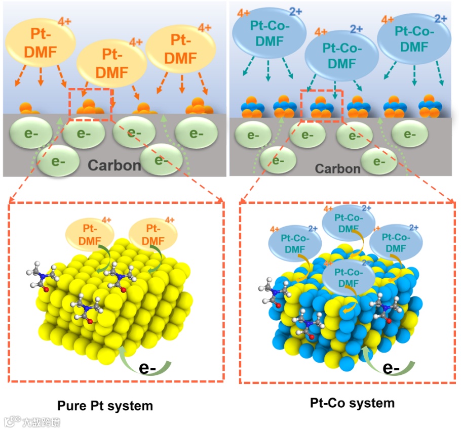 要点二:DMF与Pt和Co前驱体的络合可以缩小其沉积电位差距,从而提高合金化程度