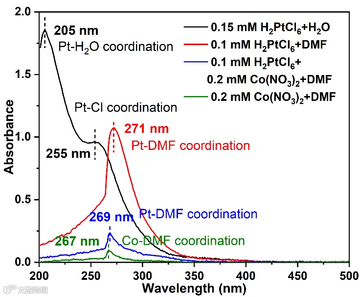 图3. 水体系中和DMF体系中,Pt前驱体和Co前驱体的UV-Vis吸收光谱图对比。