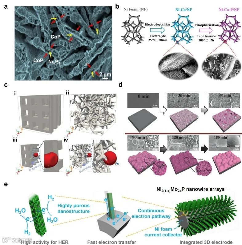 设计多孔催化剂。催化剂的多孔结构可以抑制气泡聚结,且提供丰富的气体通道,有利于反应物/产物的运输。多孔结构可以通过催化剂与多孔底物(如木材、金属泡沫)结合来实现,也可以通过表面活性剂辅助合成等化学方法直接在基底上制备多孔催化剂。