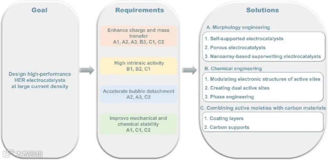 图2大电流密度下实现高性能析氢对催化剂的要求和解决方案。