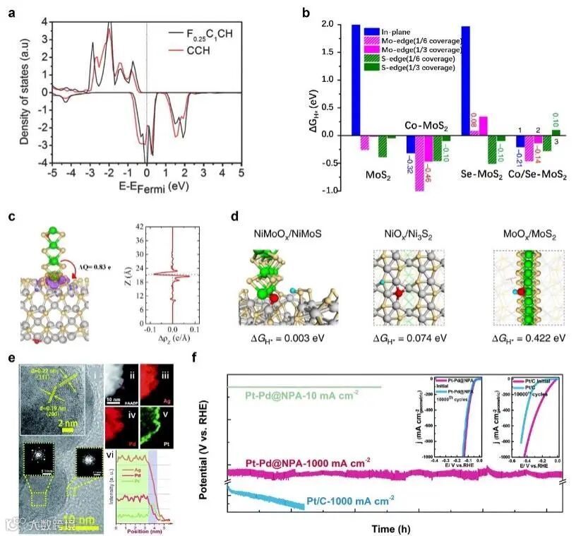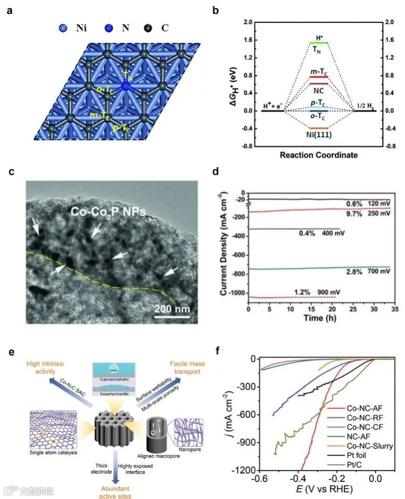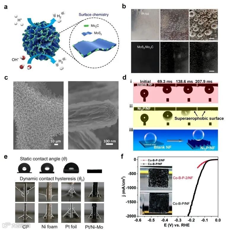 与低电流密度的情况相比,大电流密度下的高效析氢需要更大规模的电荷和质量传递。因此,更多的电子和反应物应快速抵达活性位点。同时,活性位点应具有较高的内在活性,使反应及时发生。另一个主要区别是泡沫的数量。在大电流密度下,大量气泡覆盖电极表面,严重阻碍了活性位点的暴露、电荷以及质量转移。