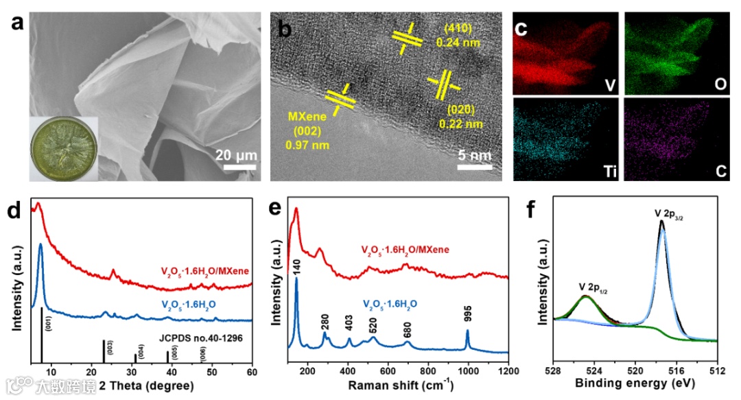 图3. (a) V2O5·1.6H2O/MXene异质结纳米片的SEM图,(b) HRTEM图以及 (c) V,O,Ti,C的元素映射图。(d) V2O5·1.6H2O及V2O5·1.6H2O/MXene的XRD图和(e) Raman谱图对比。(f)V2O5·1.6H2O/MXene中V 2p的XPS精细谱图。