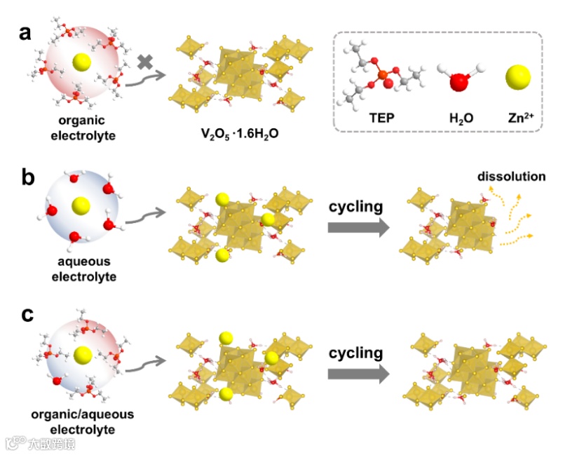 图1. V2O5·1.6H2O正极分别在Zn(OTf)2-TEP,Zn(OTf)2-H2O和Zn(OTf)2-TEP/H2O电解液中的锌储存机理。