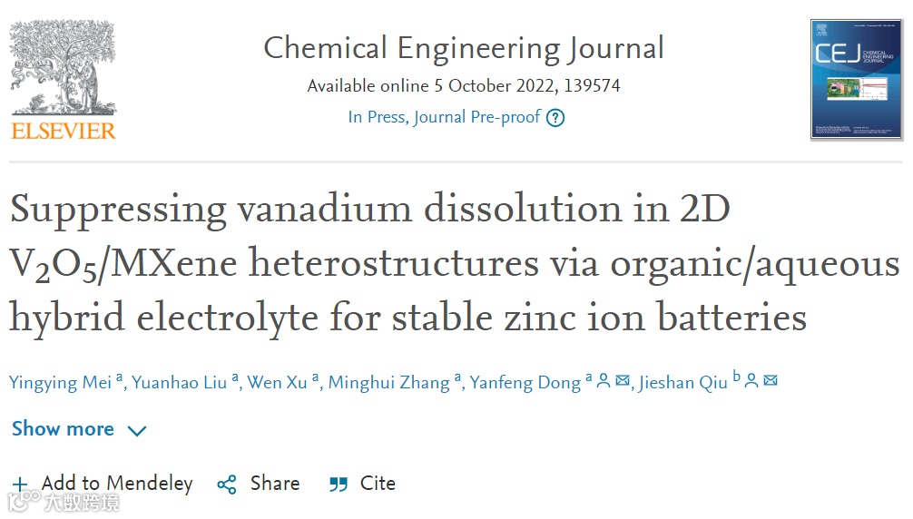 Yingying Mei, Yuanhao Liu, Wen Xu, Minghui Zhang, Yanfeng Dong*, Jieshan Qiu*. Suppressing vanadium dissolution in 2D V2O5/MXene heterostructures via organic/aqueous hybrid electrolyte for stable zinc ion batteries,Chemical Engineering Journal, 2023, 452, 139574.