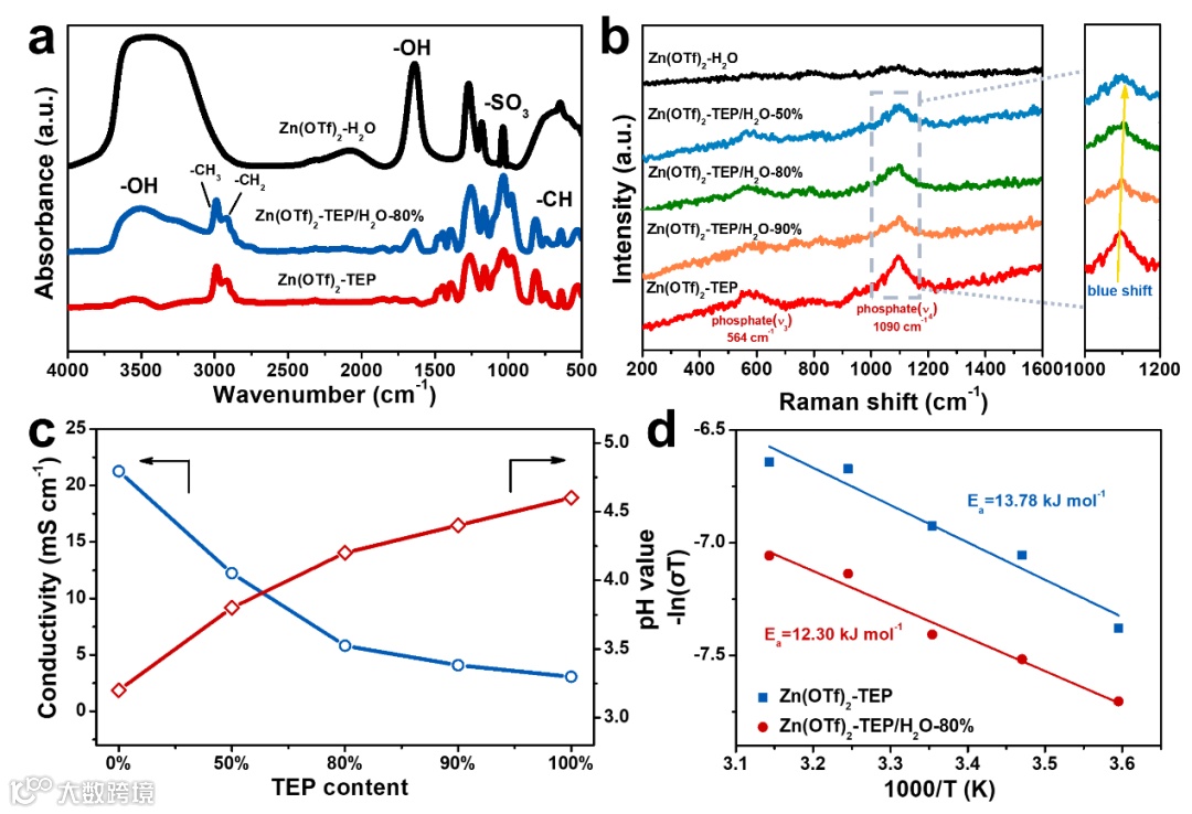 图2. (a) Zn(OTf)2-TEP, Zn(OTf)2-H2O, 及Zn(OTf)2-TEP/H2O-80%电解液的FTIR谱图。(b) Zn(OTf)2-TEP, Zn(OTf)2-H2O, Zn(OTf)2-TEP/H2O-50%, Zn(OTf)2-TEP/H2O-80%和Zn(OTf)2-TEP/H2O-90%电解液的Raman谱图以及 (c) 电导率和pH值。(d) Zn(OTf)2-TEP和Zn(OTf)2-TEP/H2O-80%电解液在5-45 oC下的Arrhenius关系图。