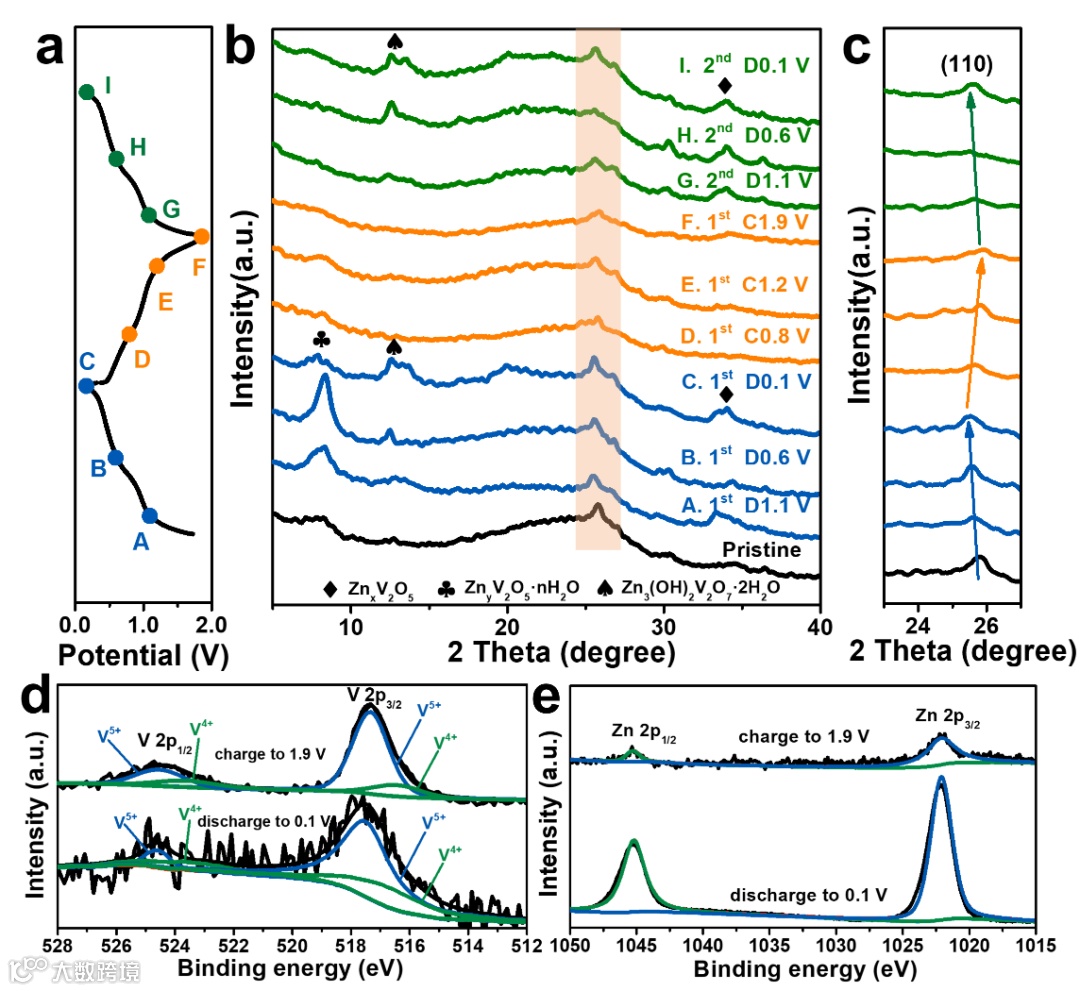 图5. (a) 第一圈和第二圈循环的GCD曲线;(b) 对应的非原位XRD图;(c) V2O5·1.6H2O/MXene的 (110) 峰放大图;(d-e) V2O5·1.6H2O/MXene在完全充电及放电状态下V 2p和Zn 2p的XPS精细谱图。