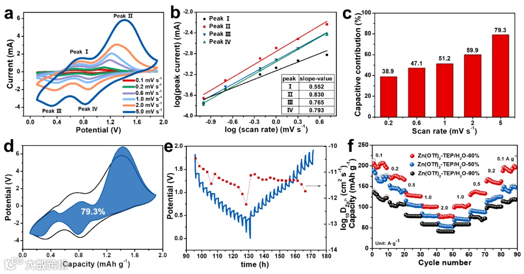 图6. (a) 0.1-5.0 mV s−1扫速下的CV曲线;(b) 不同氧化还原峰的峰值电流/扫速图;(c) 电容贡献图;(d) 5.0 mV s−1下的电容贡献占比;(e) GITT图;(f) Zn(OTf)2-TEP/H2O-50%, Zn(OTf)2-TEP/H2O-80%和Zn(OTf)2-TEP/H2O-90%电解液在不同电流密度下的倍率图。