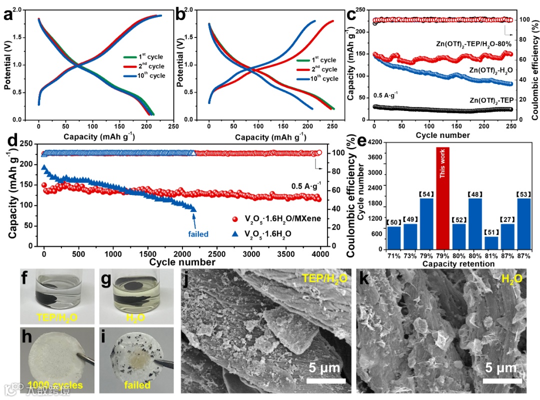 图4. (a) V2O5·1.6H2O/MXene正极在Zn(OTf)2-TEP/H2O-80%和 (b) Zn(OTf)2-H2O电解液中的GCD曲线;(c) 在Zn(OTf)2-TEP , Zn(OTf)2-H2O, 及 Zn(OTf)2-TEP/H2O-80%电解液中的循环表现;(d)V2O5·1.6H2O和V2O5·1.6H2O/MXene正极在Zn(OTf)2-TEP/H2O-80%电解液中的长循环表现;(e) 与以往报道中的钒基锌离子电池循环寿命进行比较;(f-g) V2O5·1.6H2O/MXene电极片分别在Zn(OTf)2-TEP/H2O-80%和Zn(OTf)2-H2O电解液中浸泡以及 (h-i) 循环后电池隔膜的照片;(j-k) 循环后电极的SEM图。