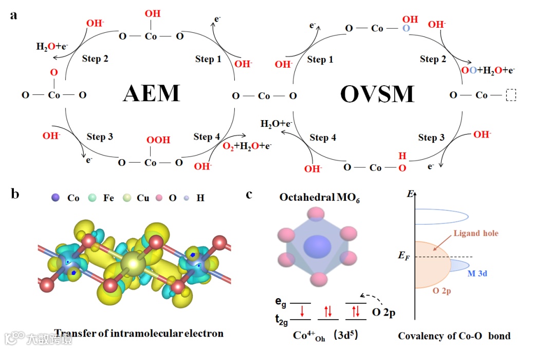 基于以上对活化前后和过程中的分析,对反应活性物种的电子态密度进行了分析。结果表明Cu的掺入使Co-O键共价性增强,使分子内电子转移形成配体空穴,促使晶格氧具备直接作为活性位点的潜力。随后,利用DFT理论计算模拟了不同机制下的OER反应路径及同反应机制下的吉布斯自由能变,结果表明Cu2S/CoFeCuOOH在OER过程中更倾向于OVSM路径。