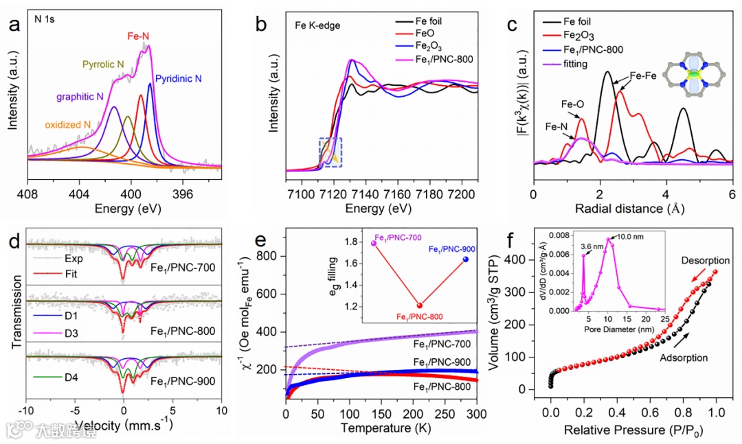 图2. (a)Fe1/PNC-800的N 1s XPS 光谱图,(b)Fe K-edge NEXAFS光谱 图,(c)Fe K-edge的EXAFS光谱图,(d)57Fe Mössbauer光谱图,(e)磁化表征 图,(f)Fe1/PNC-800的N2吸附和脱附等温线及相应的孔径分布图。