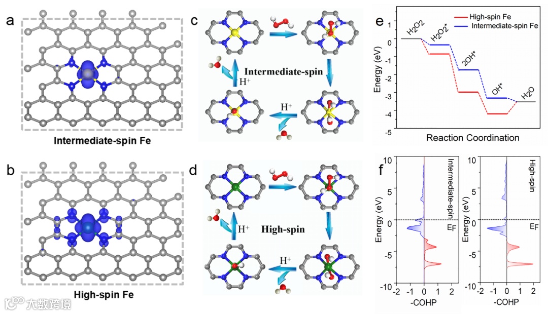 图4. (a)中自旋和(b)高自旋Fe单原子位点自旋密度侧视图。(c)中自旋和(d)高自旋Fe单原子位点催化反应路径图。(e)不同自旋态的Fe单原子位点仿过氧化物酶反应的能垒图。(f) HO*-Fe键及其在不同自旋态Fe位点上对应的pCOHP示意图。