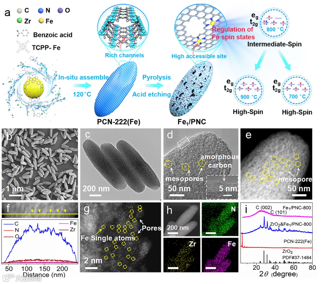 图1. (a)不同自旋态的Fe单原子位点催化剂的合成示意图。Fe1/PNC-800的(b) SEM图,(c) TEM图,(d)HRTEM图,(e-f)HAADF-STEM 图,(g)AC HAADF-STEM图,(h) EDS衍射。(i)Fe1/PNC-800和参比样品的XRD图。