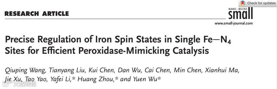 基于此,中国科学技术大学吴宇恩教授、周煌博士与南京师范大学李亚飞教授合作,在国际知名期刊Small上发表题为“Precise Regulation of Iron Spin States in Single Fe–N4 Sites for Efficient Peroxidase‑Mimicking Catalysis”的文章。该工作提出一种调控固定配位Fe单原子位点自旋的策略,以大大提高仿过氧化物酶(POD)的活性。