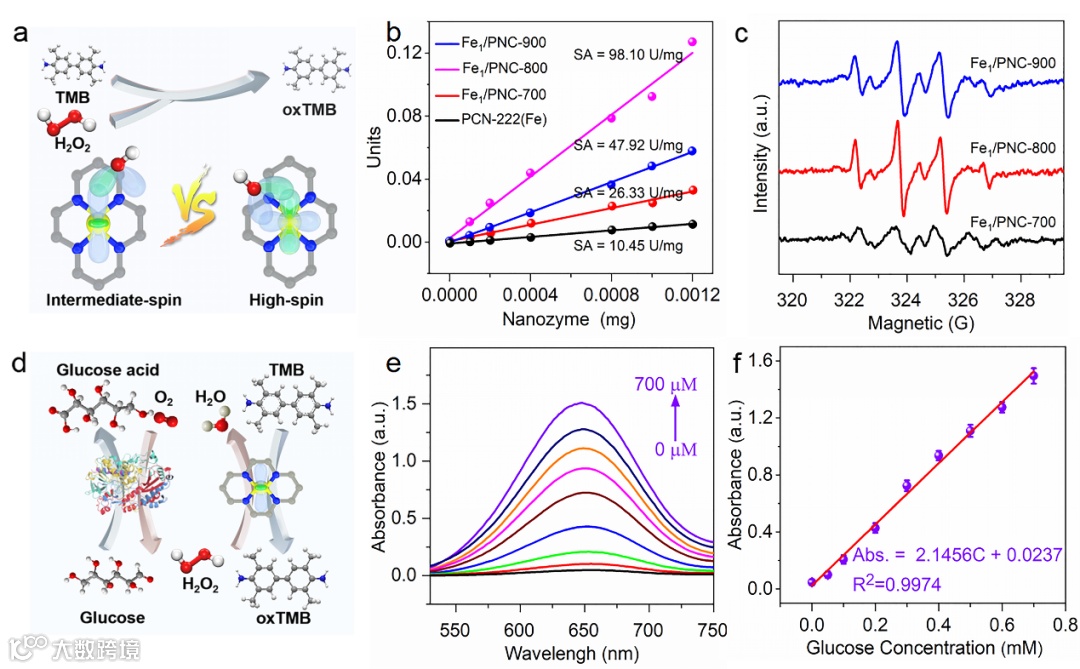 图3. (a)不同自旋态的Fe单原子位点催化剂的仿过氧化物酶活性图,(b)比活性 图及(c)中间产物 .OH的ERP图。(d)GOx&Fe1/PNC-800催化的级联反应示意图。(e) GOx&Fe1/PNC-800催化不同浓度葡萄糖的紫外/可见吸收光谱图。(f)葡萄糖检测的校准曲线图。