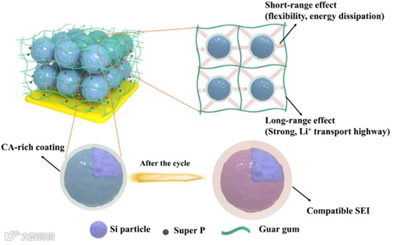 与传统的通过长链网络保护硅电极的粘结剂不同,该粘结剂通过结合GG链作为骨架和CA小分子作为接枝,协同设计长程效应(Strong, Li+ transport highway)和短程效应(Flexibility, energy dissipation),以构建一个坚固的网络,如Scheme 1所示。在长链瓜尔胶分子上通过弱相互连接引入了具有短程功能的柠檬酸(CA)分子。这种短程作用具有类似于弹簧的功能,可以有效缓冲体积变化引起的硅颗粒粉碎。因此,该电极可以有效地保持结构的一体化,一定程度上抑制电极开裂,并缓解厚度膨胀。