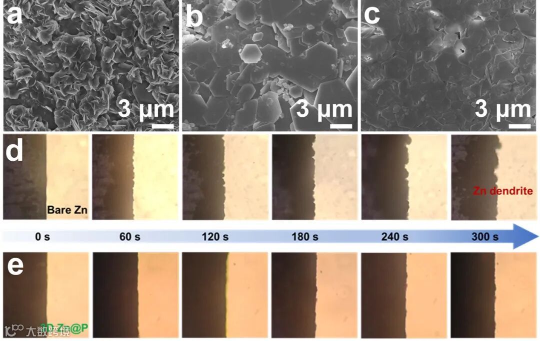 作者进一步将改性后的锌负极与铜箔组装成锌-铜非对称电池以表征沉积/剥离过程的可逆性,可以看到3D Zn@P组装成的非对称电池在首次锌沉积过程的成核过电位仅有19 mV,表明三维多孔结构为锌沉积提供了更多的成核位点。得益于此,该半电池能够稳定循环超过2000圈,平均库仑效率达到99.87%。为了分析循环寿命提升背后的机理,作者通过非原位的扫描电子显微镜和原位的光学显微镜对锌沉积行为进行了表征。
