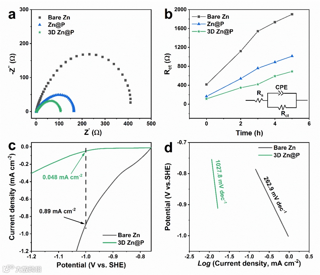 Figure 4. Electrochemical performance and stability analysis of Zn anodes. a) The A. C. impedance results of different symmetric cells. b) Time-dependent Rct results of different symmetric cells according to the equivalent circuit (inset). c) Hydrogen evolution polarization curves and d) corresponding Tafel slop curves of bare Zn and 3D Zn@P.