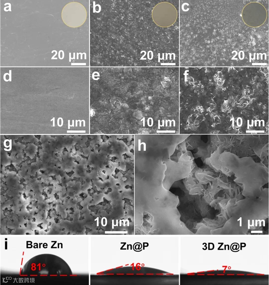 Figure 3. Morphologies and contact angles of Zn anodes. a-h) Top-view SEM images of (a,d) bare Zn, (b,e) Zn@P, (c,f) 3D Zn@P, and (g,h) 3D Zn@P after peeling off the PVDF film (Insets are the digital photo of Zn anodes). i) Optical images of contact angles between Zn anode and electrolyte.