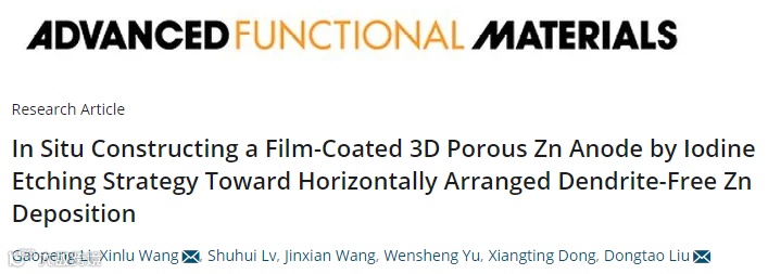 基于此,长春理工大学王昕璐副教授与东北师范大学刘东涛教授在国际知名期刊Advanced Functional Materials上发表题为“In-Situ Constructing a Film-Coated 3D Porous Zn Anode by Iodine Etching Strategy towards Horizontally Arranged Dendrite-Free Zn Deposition”的研究论文。该论文通过简单地向PVDF膜中引入碘单质成功制备了膜包覆的三维多孔锌负极,实现了抑制副反应和促进均匀锌沉积的双重效果。