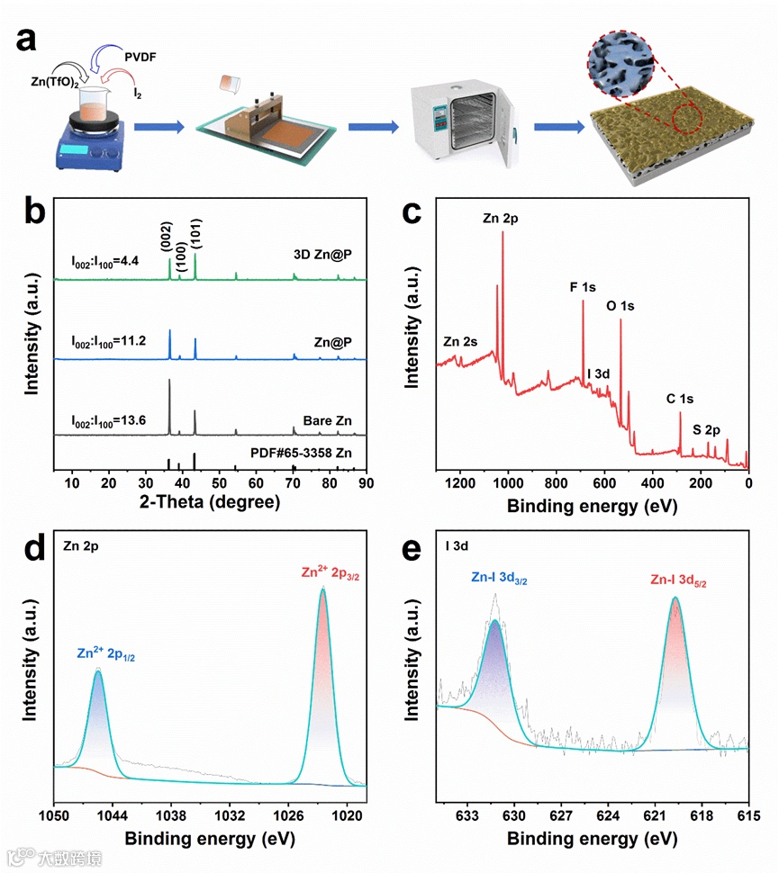 首先,作者通过简单的刮刀涂敷的方法一步合成了PVDF膜包覆的三维多孔锌负极(3D Zn@P)。从XRD谱图中可以看出刻蚀后的锌箔的002晶面的峰强度显著降低,表明锌箔表面被成功刻蚀。XPS表征表明有ZnI2的生成,证实了单质碘与金属锌之间发生了氧化还原反应(Zn+I2=ZnI2)。