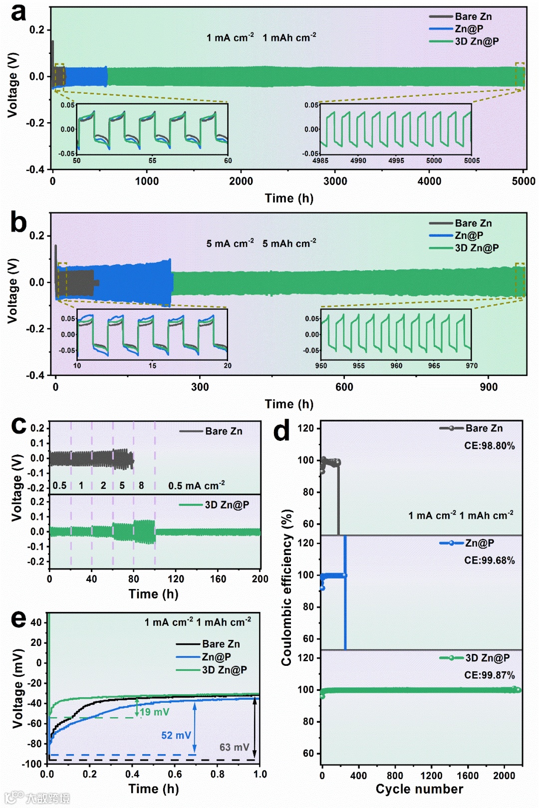 为了评估改性后的锌负极的电化学性能,组装了Zn//Zn对称电池和Zn//Cu非对称电池进行循环性能测试,其中使用3D Zn@P电极组装的对称电池展现出优异的循环稳定性。在1 mA cm–2的电流密度和1 mAh cm–2的面容量下具有超过5000小时的循环寿命,且锌沉积/剥离的极化电压只有67.5 mV。即使在5 mA cm–2的电流密度和5 mAh cm–2的面容量下该对称电池仍有超过970小时的循环寿命,累计容量达到了2425 mAh cm–2,在目前已报道的锌负极表面改性研究工作中处于先进水平,这得益于独特的三维结构可以显著降低局域电流密度,保证锌沉积的均匀性。