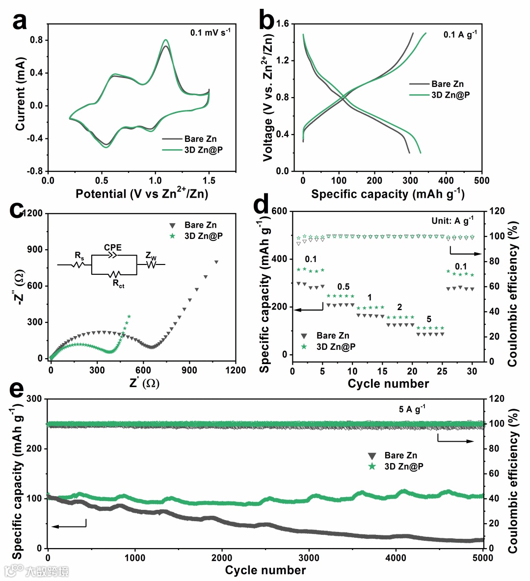 Figure 7. Electrochemical performance of the full batteries using bare Zn or 3D Zn@P anodes. a) Cyclic voltammetry curves at the scan rate of 0.1 mV s–1. b) The galvanostatic charge/discharge curves at 0.1 A g–1. c) Nyquist plots (Inset is the equivalent circuit). d) Rate performance at elevated current density. e) Long-term cycling performance at a current density of 5 A g–1.