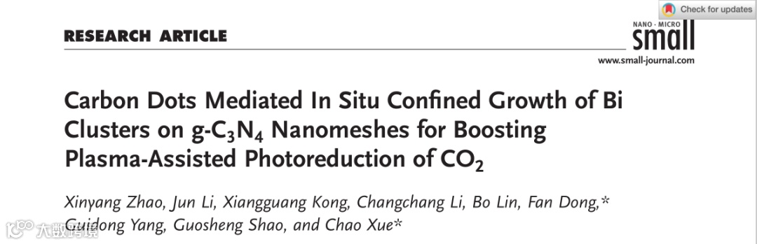 Xinyang Zhao, Jun Li, Xiangguang Kong, Changchang Li, Bo Lin, Fan Dong,* Guidong Yang, Guosheng Shao, and Chao Xue*. Carbon Dots Mediated In Situ Confined Growth of Bi Clusters on g-C3N4 Nanomeshes for Boosting Plasma-Assisted Photoreduction of CO2. Small 2022, 2204154.
