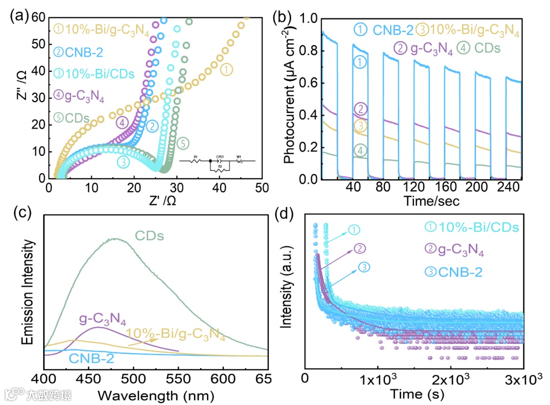 光生载流子的分离效率对于对CRR活性至关重要。由电化学阻抗谱(EIS)图(图2a)和瞬态光电流密度图(图2b)可知,CNB-2光催化剂在高频区的半圆半径最小,对应的电荷转移电阻(Rct)值最小(9.17 Ω),且瞬态光电流响应密度最高(0.9 µA·cm2),表明Bi/CDs位点和g-C3N4纳米网的耦合有利于降低g-C3N4/Bi/CDs异质结的电荷转移电阻,同时促进光生电子和空穴的有效分离。