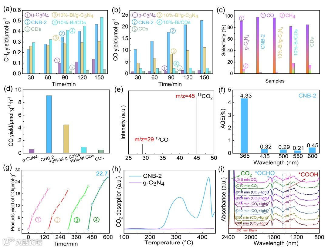 图3 CH4 (a)和CO (b)的产率以及反应选择性(c);(d) CO生成速率;(e) 13CO2同位素标记实验;CNB-2: (f) AQE和(g)循环活性测试;(h) CO2-TPD谱图;(i) CNB-2原位FT-IR光谱