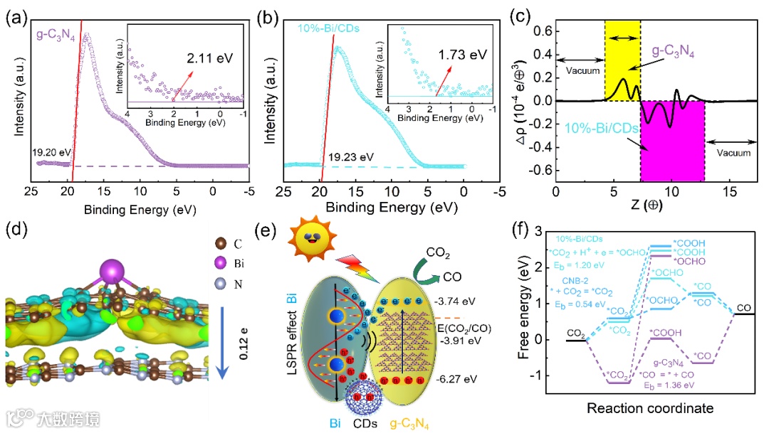 嵌入的Bi/CDs位点可以改善高电阻率g-C3N4纳米网的面内载流子迁移率,有利于电荷分离和传输。同时,在g-C3N4表面形成超薄、高导电的负电性空间电荷区域(也即反阻挡层),其对Bi团簇和g-C3N4纳米网之间的接触电阻影响极小,有利于界面电荷传输。这种精心设计的0D-2D构型,有助于等离激元Bi团簇产生的热电子自发注入到g-C3N4导带中,进而将CO2还原成CO。