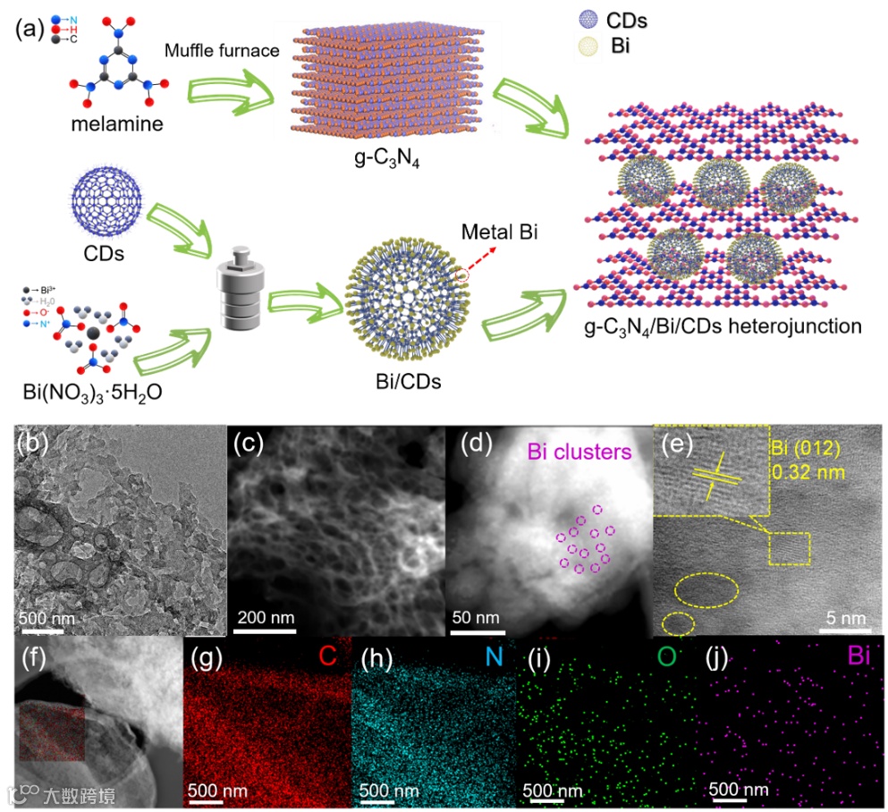 尽管CDs具有诸多优点,但我们必须认识到界面内建电场产生的驱动力对调节界面电荷分离和定向迁移起着至关重要的作用,匹配的能级配置是构建等离激元金属与光活性组分间异质界面的先决条件。若选择无毒且非贵金属的Bi作为等离激元材料来探索等离激元增强的CRR过程,高密度超分散零维Bi团簇通过CDs的精确原位限制效应均匀地锚定在2D超薄g-C3N4纳米片的表面,可以很好地解决上述瓶颈问题。