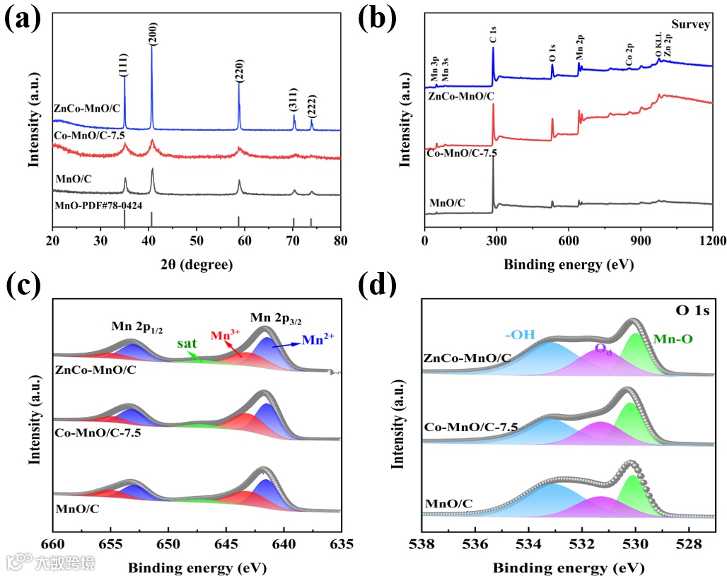 图2. ZnCo-MnO/C的XRD, XPS 表征。