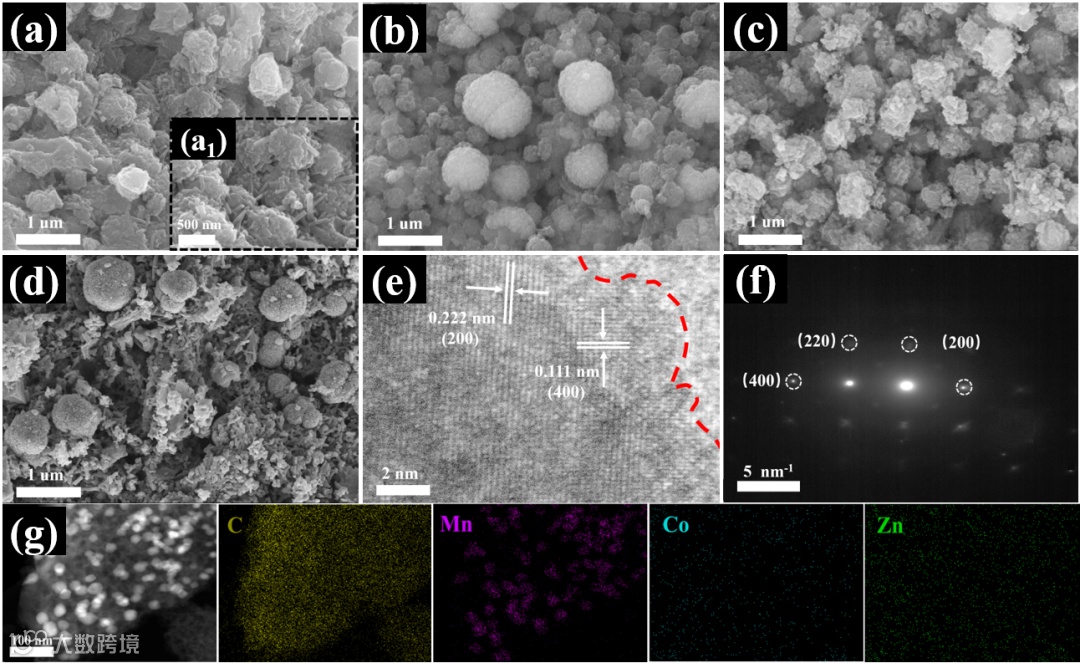 图1. ZnCo-MnO/C的SEM, HRTEM, SAED, Mapping表征。